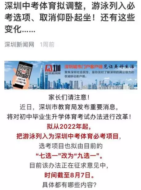 調(diào)整后,深圳體育中考分數(shù)由統(tǒng)一現(xiàn)場考試成績分值32分、過程性考核(平時成績)分值12分和《國家學(xué)生體質(zhì)健康標準》測試分值6分組成,滿分為50分。其中,體育考試考試項目仍為“1+1”,即考生參加1項必考科目和1項選考項目。必考科目由現(xiàn)在的200米跑和中長跑(800米[女]和1000米[男])任選其一調(diào)整為中長跑(800米[女]和1000米[男])或100米游泳任選其一。