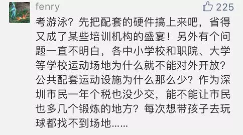 在留言中,多數(shù)家長表示,如果確定將游泳納入中考體育必考選項(xiàng),希望學(xué)校體育教學(xué)也能進(jìn)行相關(guān)配套。而小編了解到解到,目前深圳小學(xué)、初中學(xué)校開設(shè)游泳課最大的難點(diǎn)在于場地。