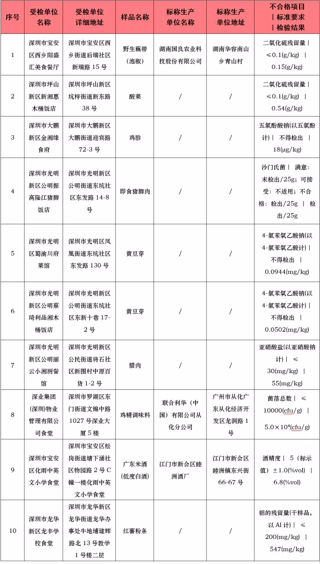 在這次抽檢中,有一批次即食豬腳肉被檢出不合格,受檢單位是深圳市光明新區(qū)公明振高隆江豬腳飯店,項(xiàng)目為沙門氏菌。
