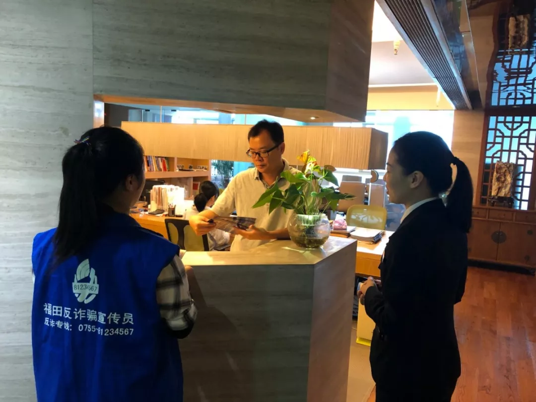上午10時(shí),深圳市公安局福田分局派出“藍(lán)馬甲”宣傳隊(duì)走入大中華國(guó)際交易廣場(chǎng),逐層逐戶向企業(yè)員工們派發(fā)反詐騙宣傳單及《福田反詐騙教育專刊》。“藍(lán)馬甲”宣傳隊(duì)員走進(jìn)各企業(yè)辦公室,向企業(yè)員工派發(fā)相關(guān)資料,講解反詐騙知識(shí)。各企業(yè)員工積極參與,與“藍(lán)馬甲”講師頻頻互動(dòng),并認(rèn)真學(xué)習(xí)反詐騙技巧,努力提升自身反詐騙能力。