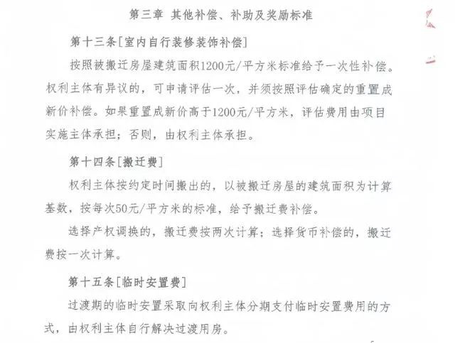 此外,室內(nèi)自行裝修裝飾補償標(biāo)準(zhǔn),將按照被搬遷房屋建筑面積1200元 /平方米標(biāo)準(zhǔn)給予一次性補償。搬遷費以被搬遷房屋的建筑面積為計算基數(shù),按每次50元 /平方米的標(biāo)準(zhǔn),給予搬遷費補償。