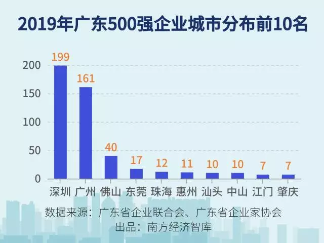 在這份榜單中,500家入選企業(yè)分布于廣東19個城市。其中,超過九成來自珠三角城市,前10強(qiáng)企業(yè)來自廣州、深圳、佛山三市,2018年營業(yè)收入超過1千億的21家企業(yè)同樣來自珠三角,其中深圳11家,廣州6家,佛山2家,珠海和惠州各有1家。