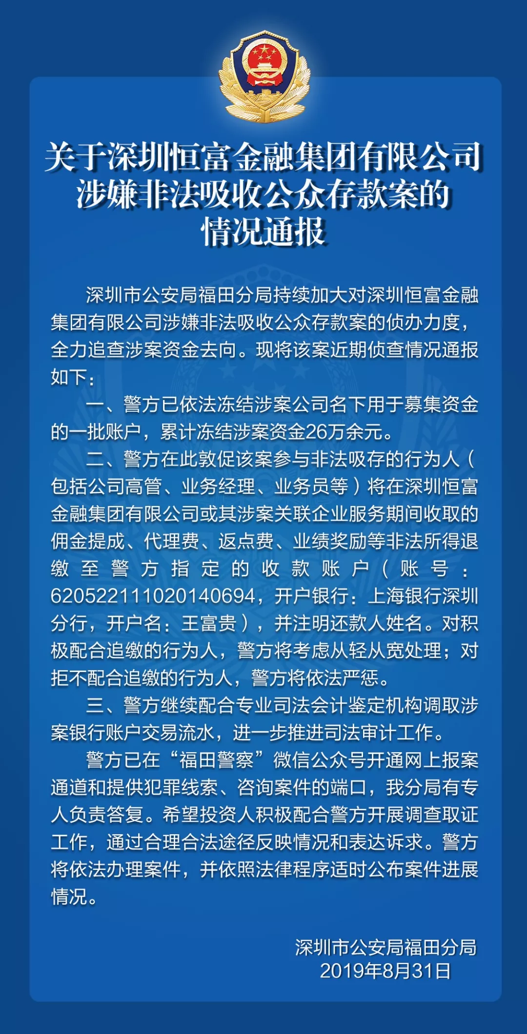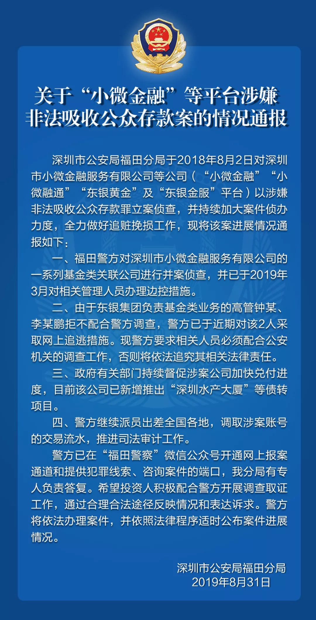 關(guān)于深圳恒富金融集團(tuán)、“小微金融”等平臺的案情通報