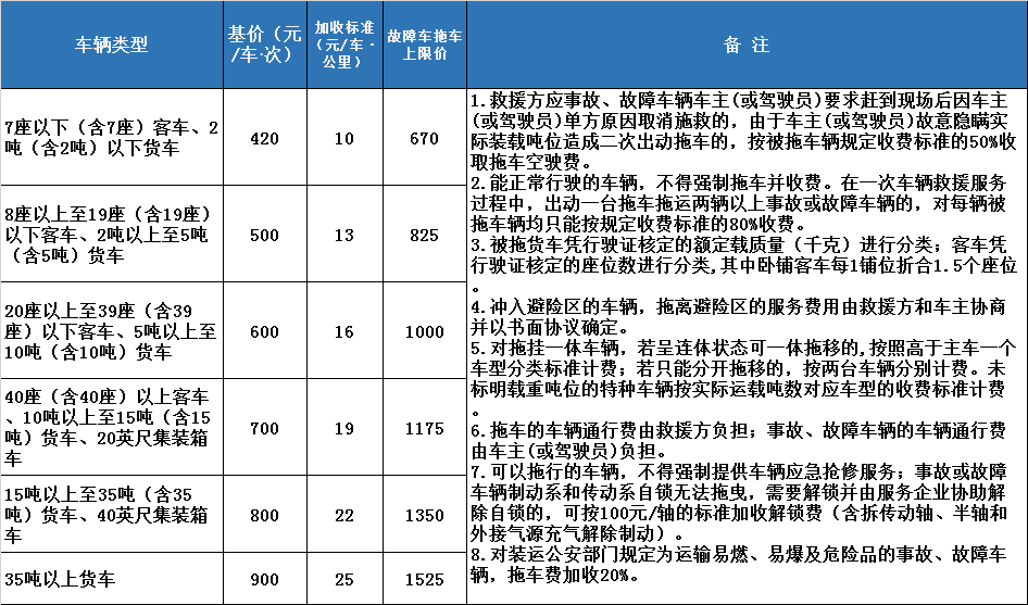 廣東省高速公路拖車(chē)服務(wù)收費(fèi)標(biāo)準(zhǔn)見(jiàn)下表: