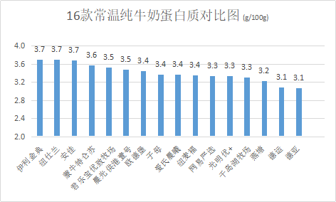 16款常溫純牛奶蛋白質(zhì)含量均符合我國(guó)國(guó)標(biāo)要求,但蛋白質(zhì)含量表現(xiàn)差異大,伊利金典、紐仕蘭、安佳、蒙牛特侖蘇蛋白質(zhì)含量較高,德運(yùn)、德亞蛋白質(zhì)含量相對(duì)較低,接近國(guó)標(biāo)最低限值要求。