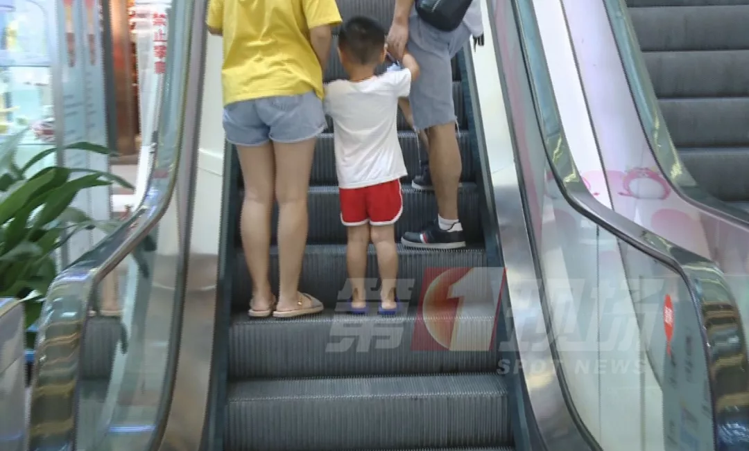 在商場的自動扶梯上,兒子的洞洞鞋被卷進了扶梯的空隙導(dǎo)致腳拔不出來。