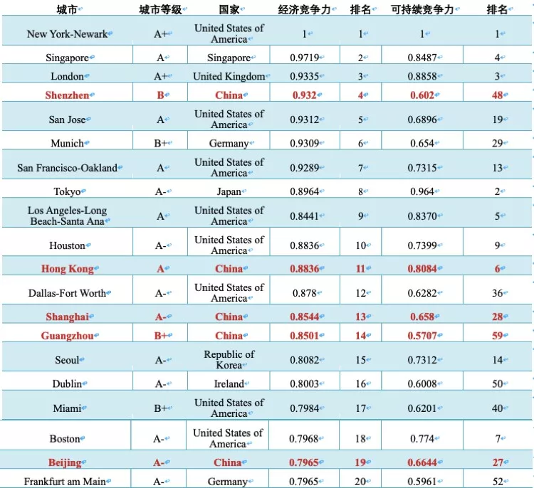 全球城市經(jīng)濟(jì)競爭力指數(shù)前二十強(qiáng)
