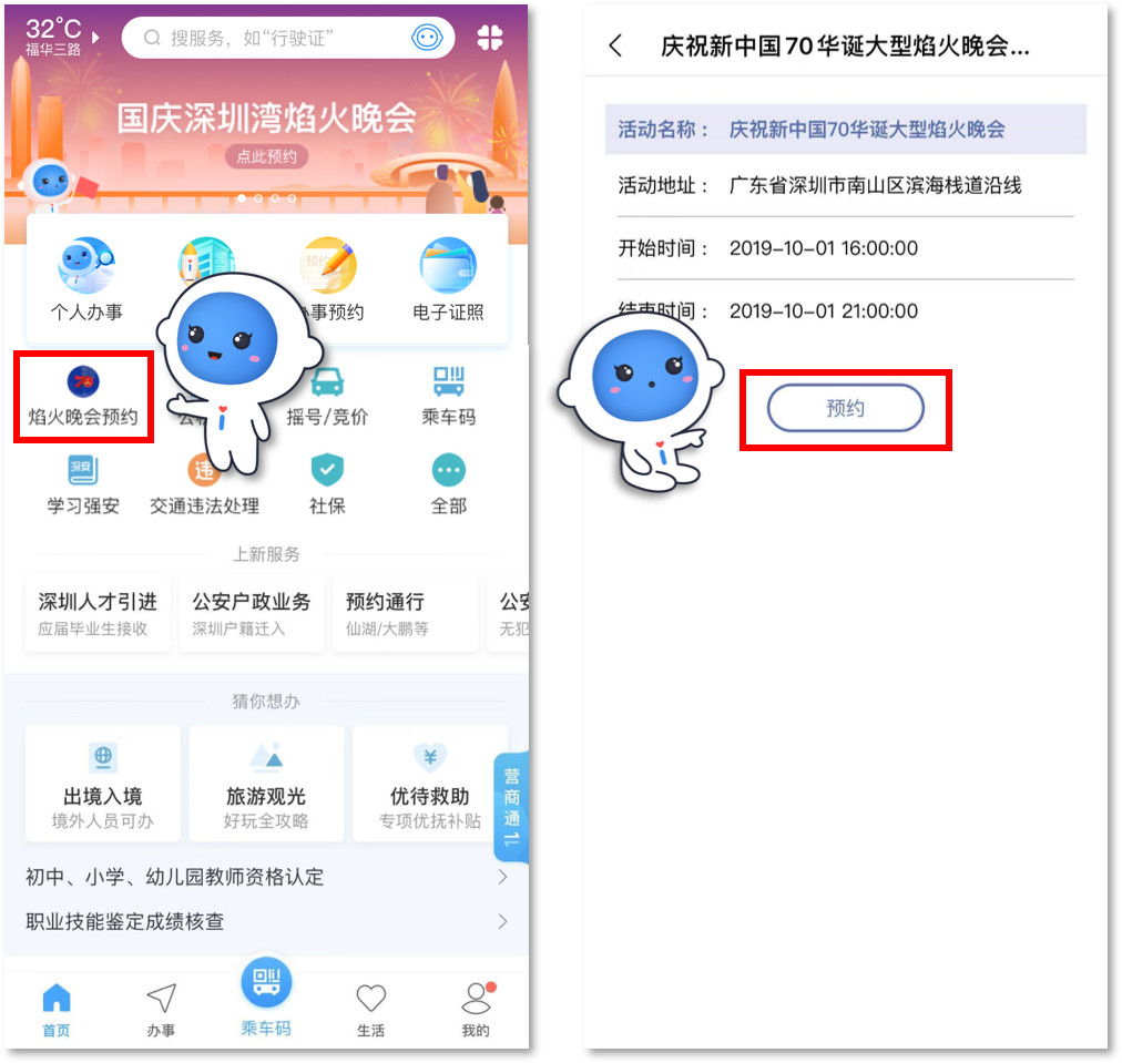 2.點(diǎn)擊首頁頂部圖片或焰火晚會預(yù)約入口進(jìn)入預(yù)約頁面,點(diǎn)擊預(yù)約: