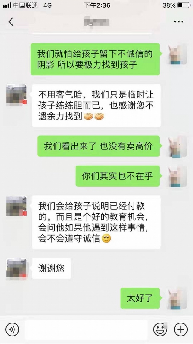 賣(mài)水男孩爸爸告訴張先生,他是從朋友的轉(zhuǎn)發(fā)中,看到這個(gè)消息的。他介紹說(shuō),他們那天只是臨時(shí)讓孩子練練膽,并對(duì)張先生努力尋找孩子,實(shí)現(xiàn)對(duì)孩子承諾的誠(chéng)信行為表示感謝。“我會(huì)給孩子說(shuō)明已經(jīng)付款的,而且這是個(gè)好的教育機(jī)會(huì),我會(huì)問(wèn)他,如果他遇到這樣的事情,會(huì)不會(huì)遵守誠(chéng)信?!辟u(mài)水男孩爸爸告訴張先生,“沒(méi)有想到你為了守護(hù)一份誠(chéng)信,借助網(wǎng)絡(luò)媒體的力量,花大力氣尋找并支付礦泉水錢(qián),這份堅(jiān)持,讓我們和孩子都非常感動(dòng)。我們也已經(jīng)與孩子溝通整件事情,并借此機(jī)會(huì)告訴他換位思考,如果遇到類(lèi)似情況,也應(yīng)堅(jiān)持誠(chéng)信、與人為善的傳統(tǒng)美德。”