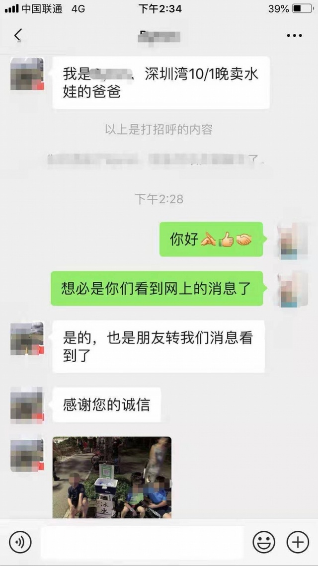 4日,剛從深圳返回青島的張先生告訴記者,中午2時(shí)35分,他的微信出現(xiàn)一個(gè)新增好友,對(duì)方說(shuō)自己是深圳灣10月1日晚賣(mài)水男孩的爸爸,張先生立刻把對(duì)方加為好友。賣(mài)水男孩爸爸通過(guò)微信給張先生發(fā)來(lái)一張照片,是國(guó)慶當(dāng)晚孩子在路邊賣(mài)水時(shí)拍的,讓張先生確認(rèn)一下是不是照片上的孩子?!笆撬麄?,太好了,終于找到了?!睆埾壬S即通過(guò)微信轉(zhuǎn)賬10元錢(qián)過(guò)去,賣(mài)水男孩爸爸也收款成功。(此前報(bào)道:緊急尋人!深圳灣畔的賣(mài)水孩子,青島大叔在找你…)