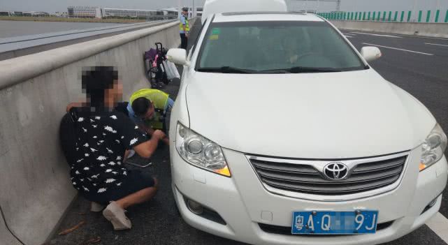 10月5日下午4點多,珠海交警郭警官開著警車在珠三角環(huán)線高速巡邏時,看到有一輛粵AQ××9J號白色豐田小車??吭趹?yīng)急車道上,打著雙閃。郭警官立即上前詢問情況,原來小車剛上高速沒多久就爆胎了,司機(jī)深知在高速停下來很危險,急得團(tuán)團(tuán)轉(zhuǎn),天還下起了小雨。