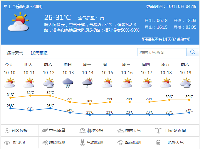 見圳客戶端·深圳新聞網(wǎng)2019年10月10日訊 據(jù)深圳市氣象局消息,今日深圳晴天間多云,空氣干燥;氣溫26-31℃;偏東風2-3級,沿海和高地最大陣風6-7級;相對濕度50%-90%。