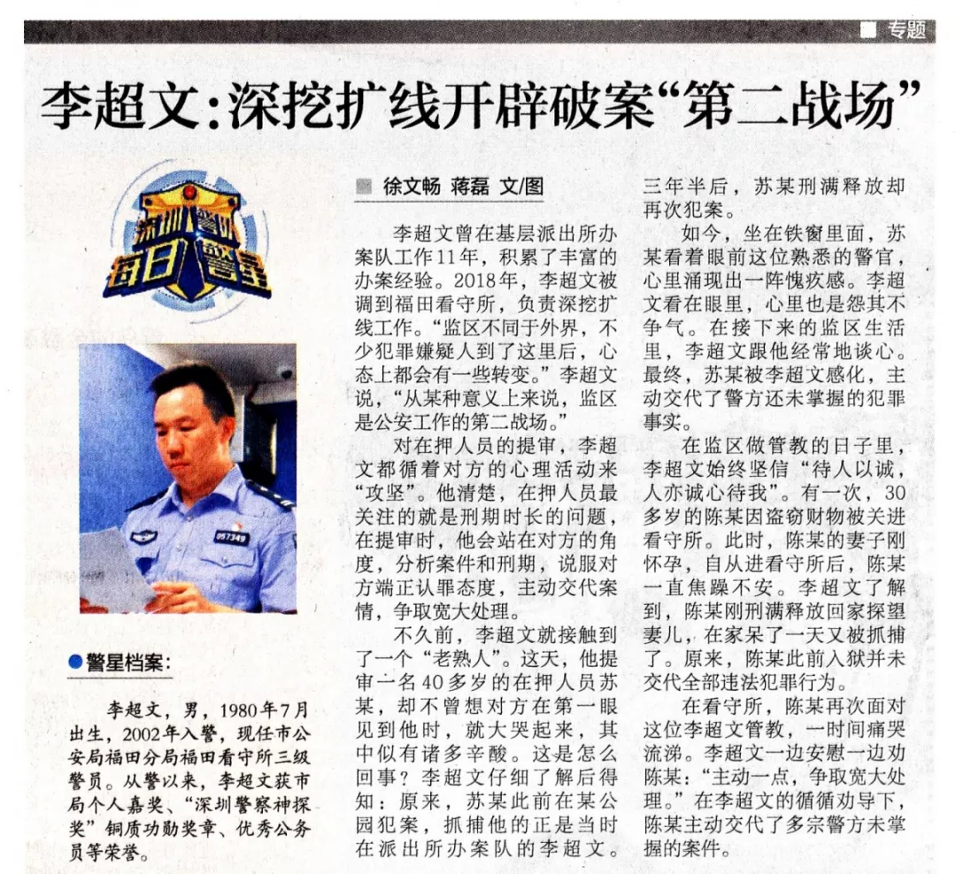 李超文曾在基層派出所辦案隊(duì)工作11年,積累了豐富的辦案經(jīng)驗(yàn)。2018年,李超文被調(diào)到福田看守所,負(fù)責(zé)深挖擴(kuò)線工作?!氨O(jiān)區(qū)不同于外界,不少犯罪嫌疑人到了這里后,心態(tài)上都會(huì)有一些轉(zhuǎn)變。”李超文說(shuō),“從某種意義上來(lái)說(shuō),監(jiān)區(qū)是公安工作的第二戰(zhàn)場(chǎng)?!?/p>