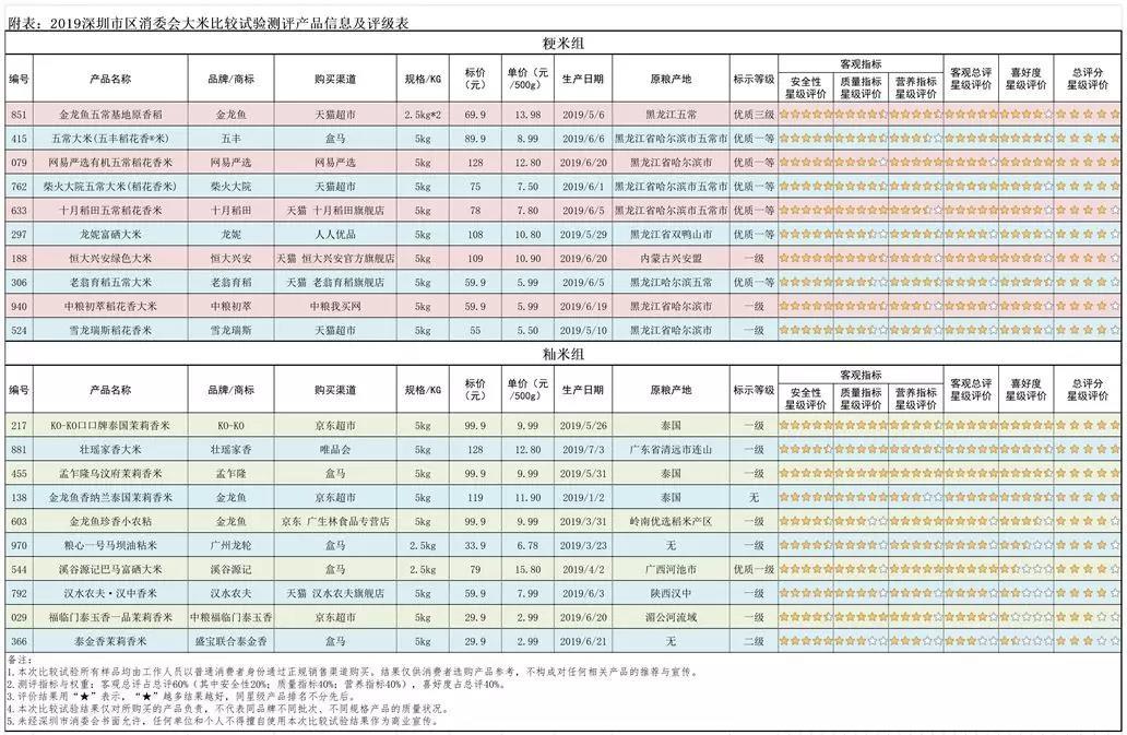 大米比較試驗測評產(chǎn)品信息及評級表↓