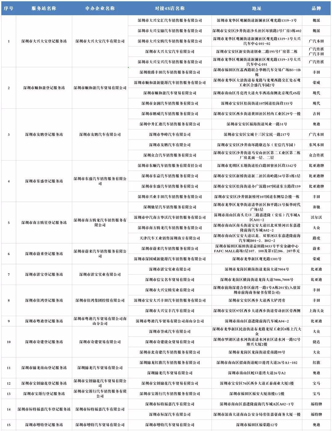 據(jù)悉,2019年9月2日,深圳市交管部門選定15家新車登記服務(wù)站、5家二手車登記服務(wù)站為第一批快捷代辦登記試點(diǎn),各試點(diǎn)可以備案多家沒有服務(wù)站的4S店(需將資料交至車管所備案)。