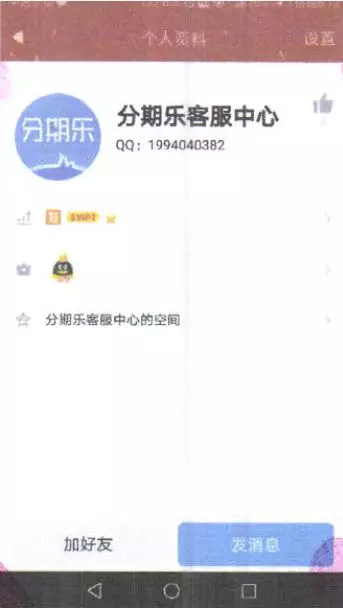 各種信息都對的上,陳林隨即添加了對方的QQ(昵稱:分期樂客服中心)。