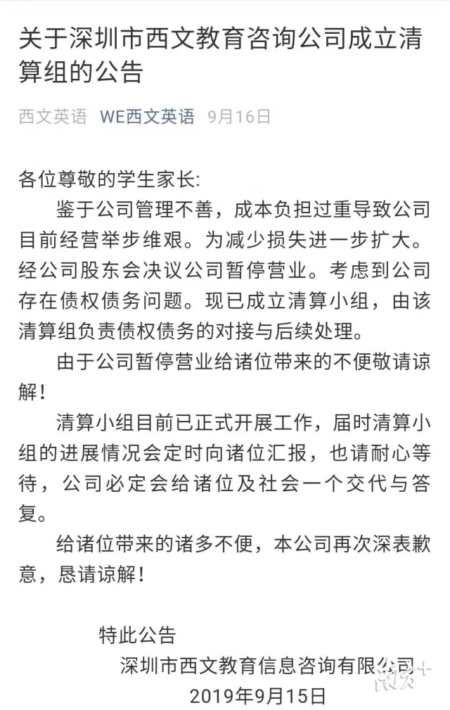 9月16日推文說“公司管理不善,暫停營業(yè)??紤]到公司存在債權(quán)債務(wù)問題,現(xiàn)已成立清算小組。由該清算組負(fù)責(zé)債權(quán)債務(wù)的對(duì)接與后續(xù)處理?!?/p>