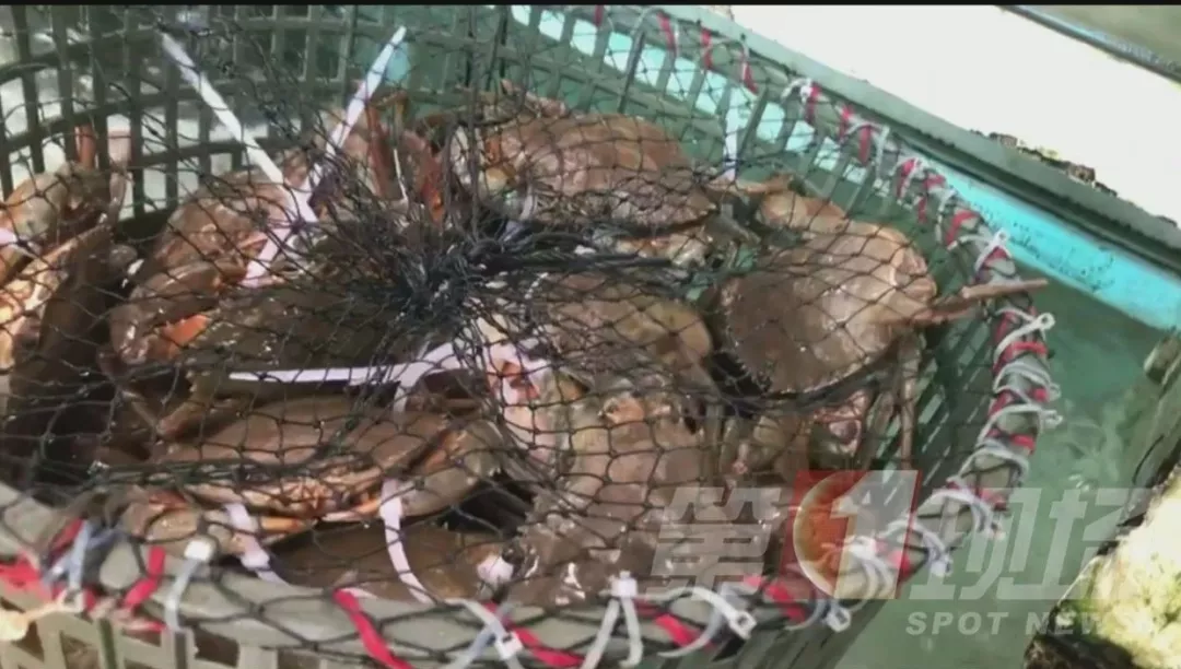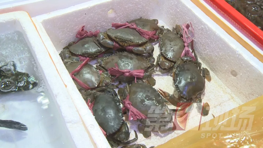 ▲羅芳水產(chǎn)批發(fā)市場(chǎng)內(nèi),膏蟹用白色塑料繩來(lái)捆綁。