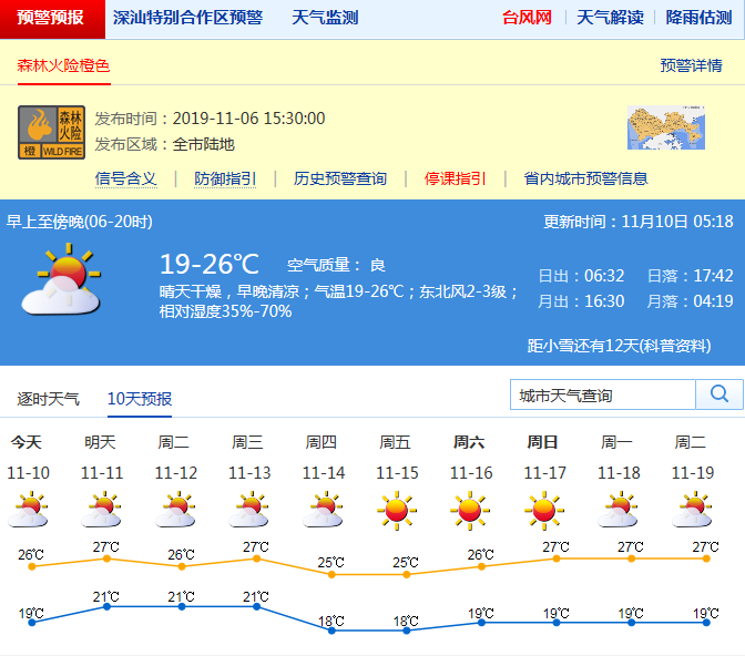 見圳客戶端·深圳新聞網(wǎng)2019年11月10日訊 深圳市氣象臺(tái)預(yù)計(jì)10-11日晴天間多云,空氣非常干燥,早晚清涼,10日氣溫19-26℃;12日云量增多,13-14日受冷空氣影響,北風(fēng)明顯加大,氣溫下降;15-17日晴天干燥,早晚清涼。