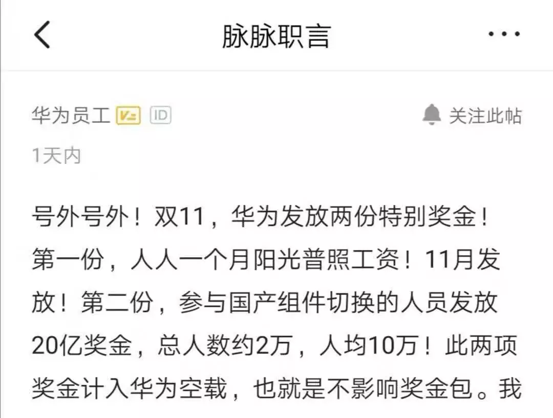 11月11日,據(jù)華為員工在職場(chǎng)社交平臺(tái)爆料稱,華為給員工發(fā)放了兩份特別獎(jiǎng)金:
