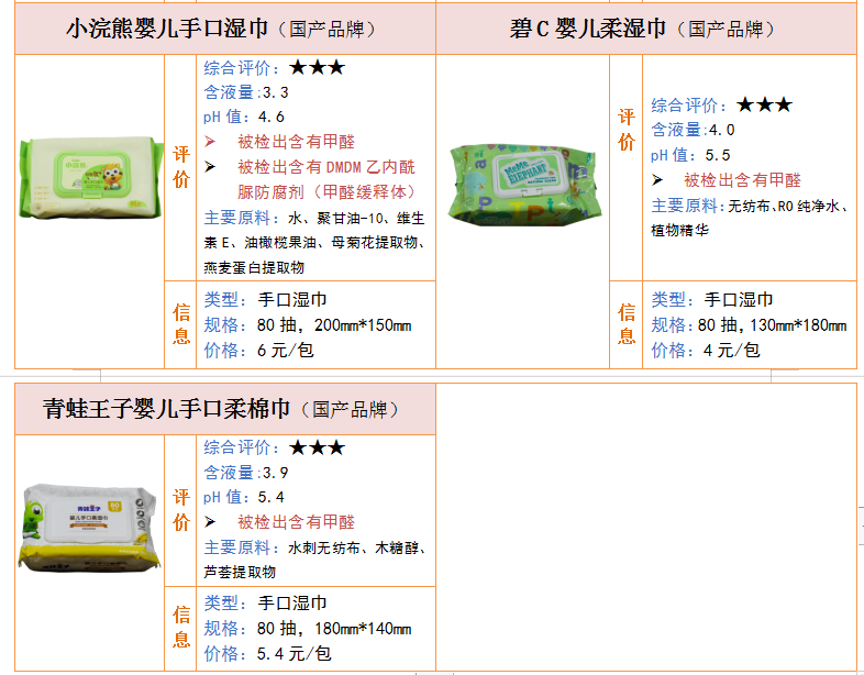 值得注意的是,有5款嬰幼兒濕巾樣品被檢出含有甲醛,但未超過歐盟法規(guī)限值要求??紤]到寶寶的皮膚比較敏感,且很多寶媽直接用嬰幼兒濕巾擦拭寶寶的嘴巴、小手等,建議購買不含甲醛的嬰幼兒手口濕巾。分別是小浣熊嬰兒手口濕巾、青蛙王子嬰兒手口柔棉巾、子初洋甘菊嬰兒手口柔棉巾、怡恩貝手口濕巾、碧C嬰兒柔濕巾。