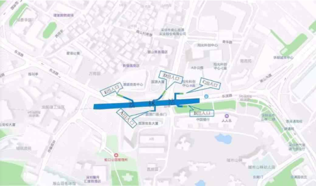 怡海站位于怡海大道與月亮灣大道中間,車站出入口共計4個,B、D出入口預(yù)留,A出入口接光大銀行,連接怡海大道,C出入口前海展廳旁,連接A號公路