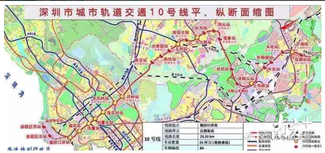 地鐵10號線,南連與香港毗鄰的福田口岸站,北接龍崗區(qū)雙擁街,線路全長約29公里,共設車站24座。