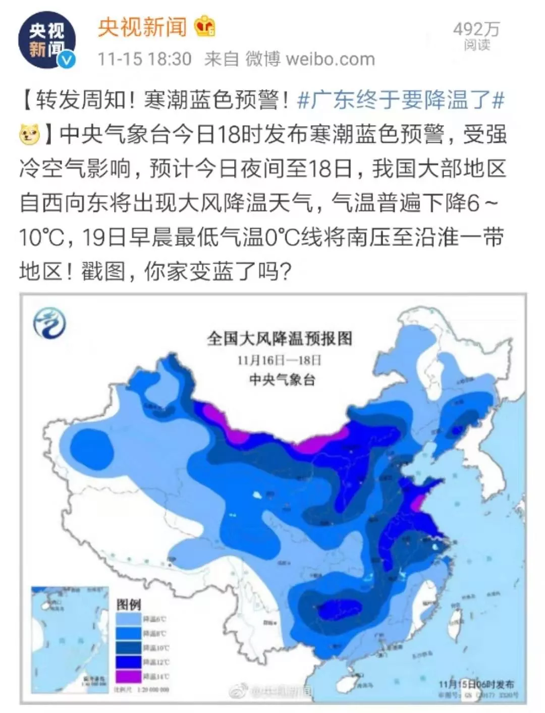 中央氣象臺(tái)于15號(hào)發(fā)布寒潮藍(lán)色預(yù)警!