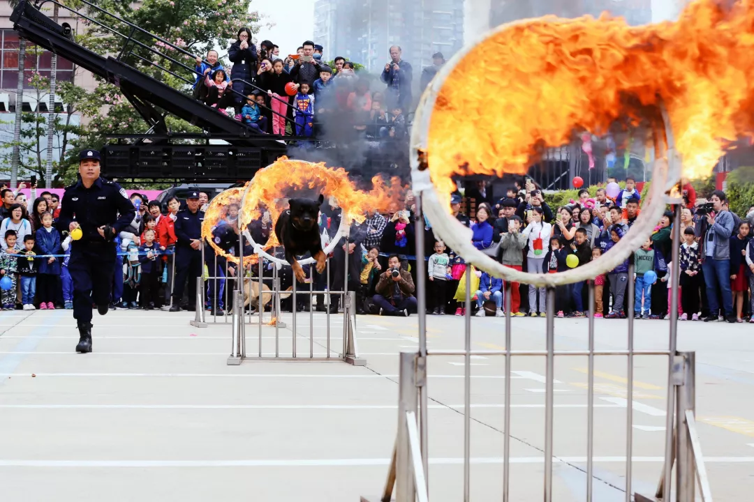 演出科目:跳躍人體障礙、實戰(zhàn)撲咬、箱包搜索、解救人質(zhì)、跳火圈等