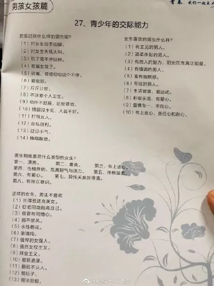 中國新聞網(wǎng)2019年12月6日訊 有網(wǎng)友舉報(bào)稱,深圳市龍華區(qū)發(fā)放的《中小學(xué)青春期心理生理衛(wèi)生常識(shí)手冊(cè)》中存在性別歧視等問題,有“這樣的女生,男生不喜歡”,“女生喜歡的男生什么樣?(6):有錢”,“男生不喜歡的女生什么樣?(9):拜金”等種種不當(dāng)表述。12月5日,深圳市龍華區(qū)教育局回應(yīng)稱,已立即停止該項(xiàng)目,同時(shí)安排收回所有已下發(fā)的資料冊(cè)。