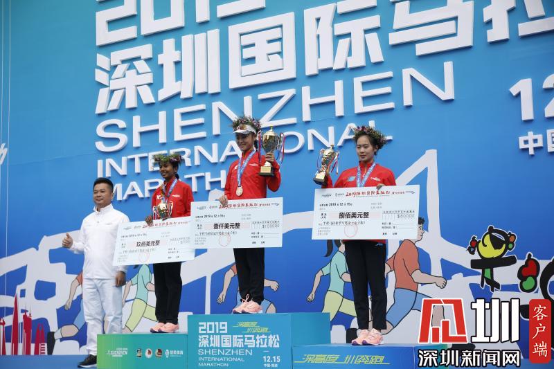 女子半程馬拉松前三名選手合影留念。