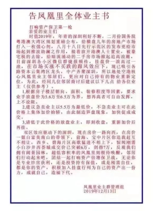 近日,福海街道中糧鳳凰里花苑小區(qū)個(gè)別業(yè)主發(fā)布集體漲價(jià)言論,涉嫌惡意炒作二手房?jī)r(jià),以下為網(wǎng)傳業(yè)主倡議書(shū)