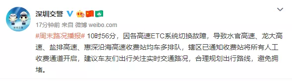 10時56分,因各高速ETC系統(tǒng)切換故障,導致水官高速、龍大高速、鹽排高速、惠深沿海高速收費站均車多排隊,轄區(qū)已通知收費站將所有人工收費通道開啟,建議車友們出行關注實時交通路況,合理規(guī)劃出行路線,避免擁堵。