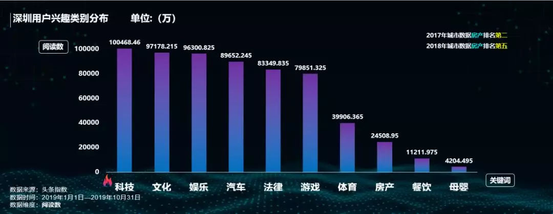 今年深圳網友對科技最感興趣,文化次之。房產排名連續(xù)兩年下滑,2017年排名第二,2018年跌至第五,而今年降至第八。