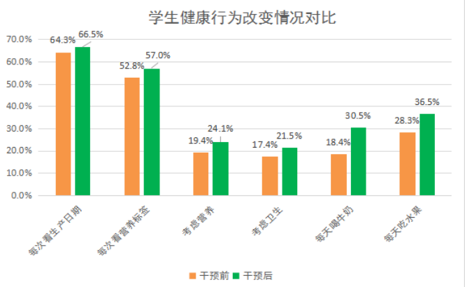 通過1學(xué)年的營養(yǎng)教育活動(dòng),評(píng)估發(fā)現(xiàn),學(xué)生選擇經(jīng)常吃的零食中,水果類排名第一,占69.6%;糖果類由26.6%明顯下降至19.9%,降幅25%。經(jīng)常喝的飲料依次是白開水、純牛奶酸奶、果汁和碳酸飲料,干預(yù)后白開水和牛奶比例分別提升至83.4%和76.7%,升幅均超過10%;果汁和碳酸飲料分別降低至38.9%和17.3%,尤其是碳酸飲料降幅超過了30%。每天喝牛奶的比例明顯提升至30.5%,升幅65.8%;每天吃水果的比例提升至36.5%,升幅達(dá)到36.5%。每天吃早餐的比例由67.8%上升至74%。