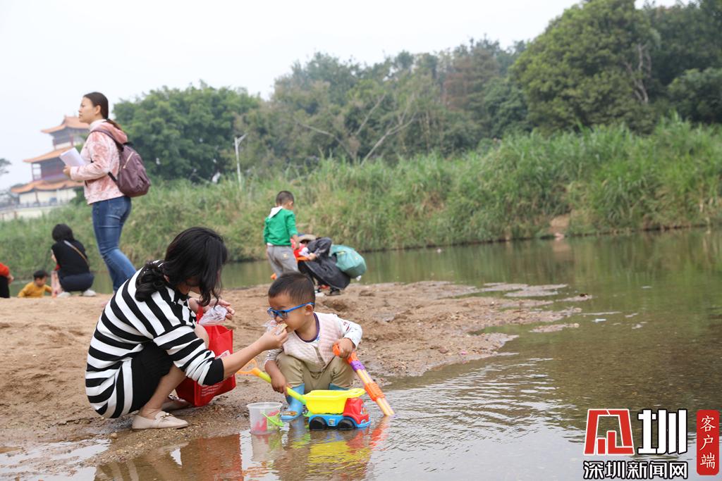 許多家長帶著孩子到河邊游玩。