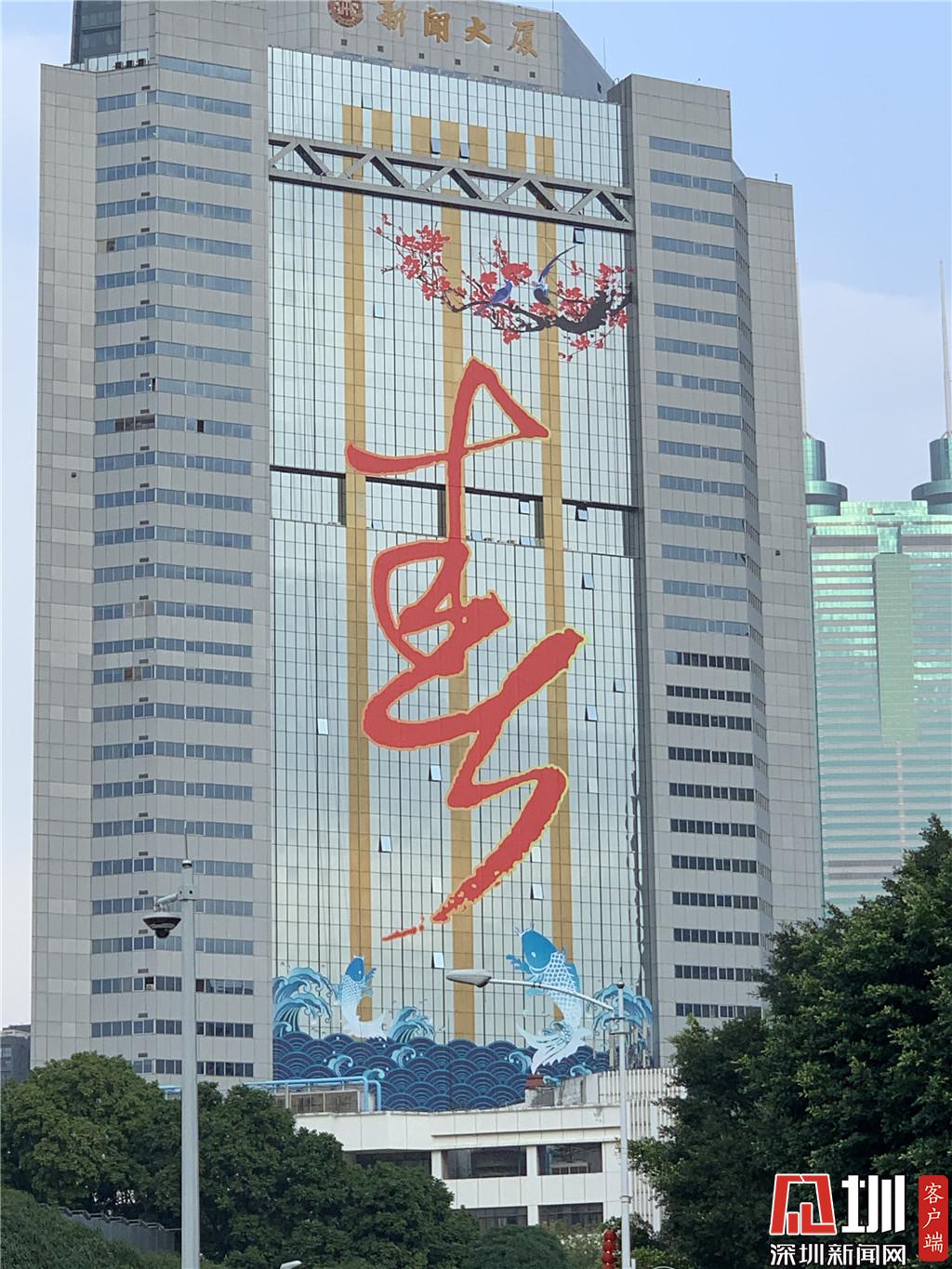 新聞大廈外立面設(shè)置巨幅迎春壁畫。