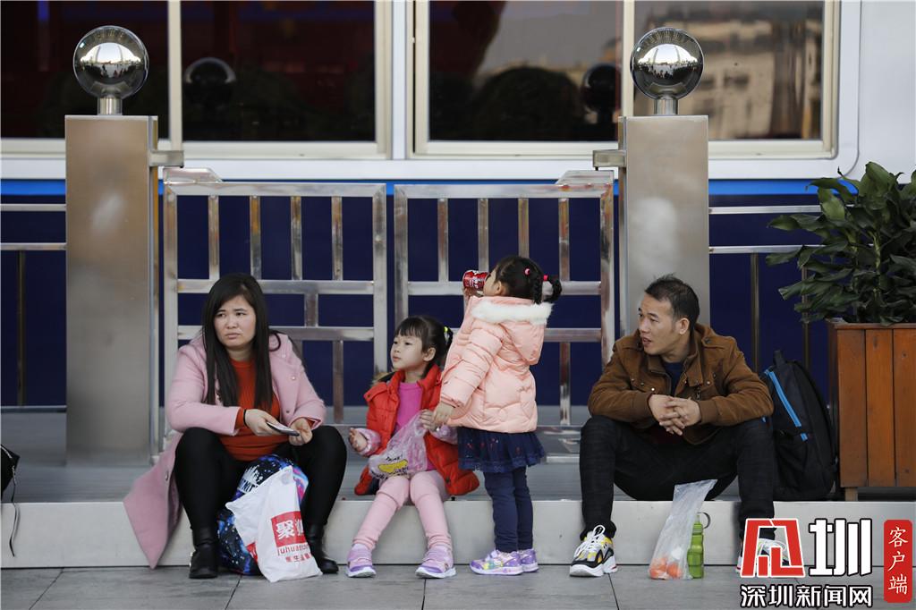 深圳北站東廣場(chǎng),兩個(gè)小女孩正和家人等車(chē)。