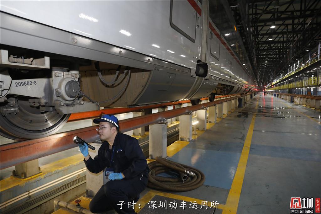子時(shí):凌晨0點(diǎn)26分,深圳動(dòng)車運(yùn)用所檢修車間內(nèi),動(dòng)車地勤機(jī)械師陳愷正在給“下班”的動(dòng)車檢修。據(jù)了解,深圳動(dòng)車所的員工有600多人,平均年齡只有25歲,每年春節(jié),他們都要在動(dòng)車所里度過。