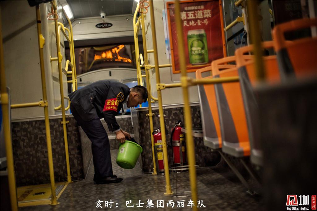 亥時:22點50分左右,深圳巴士集團四分公司西麗車隊駕駛員張華林收班后,在給他的“老搭檔”進行衛(wèi)生清潔,第二天,他和他的搭檔又將上路,為市民服務。