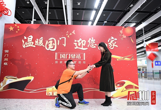 1月20日,西九龍邊檢站“國門驛站”展板前,在邊檢民警的掌聲和祝福中,旅客官先生鄭重向女友宋女士求婚,有情人終成眷屬,“在國門求婚,把愛人帶回家門”成為一段佳話。為營造溫馨喜慶的春節(jié)氛圍,該站在口岸設(shè)置主題活動展板,懸掛節(jié)日裝飾,還研發(fā)小程序,在驗證臺一體機(jī)向旅客展示主題海報,令人耳目一新。