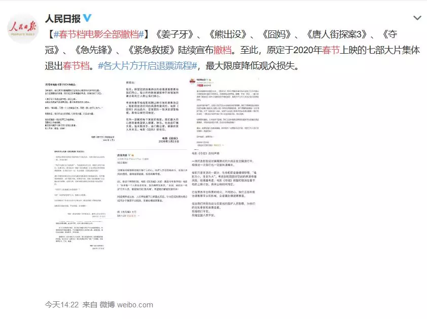 因“擔(dān)憂疫情進(jìn)一步擴(kuò)散”、“考慮影院密閉空間的病源傳播風(fēng)險(xiǎn)”等因素,23日,2020春節(jié)檔的七部影片《唐人街探案3》《囧媽》《奪冠》《緊急救援》《姜子牙》《熊出沒·狂野大陸》《急先鋒》集體宣布撤檔,均將擇日再映。各大片方開啟退票流程,最大限度降低觀眾損失。