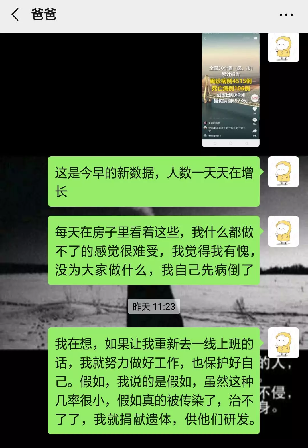 高強(qiáng)度的密閉性工作,李生蘭病倒了,病床上她依然數(shù)次“請(qǐng)戰(zhàn)”。在發(fā)給爸爸的微信中,她寫道,“假如我倒在了崗位上,請(qǐng)捐獻(xiàn)我的遺體!”把我的遺體捐獻(xiàn),我希望能為這次疫情做點(diǎn)什么!