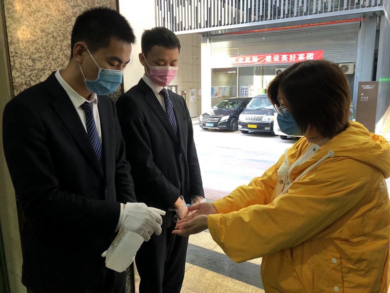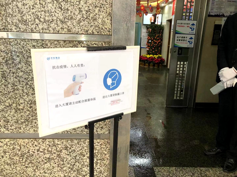 值班保安對(duì)每個(gè)進(jìn)入進(jìn)入小區(qū)的人進(jìn)行體溫測(cè)量和消毒