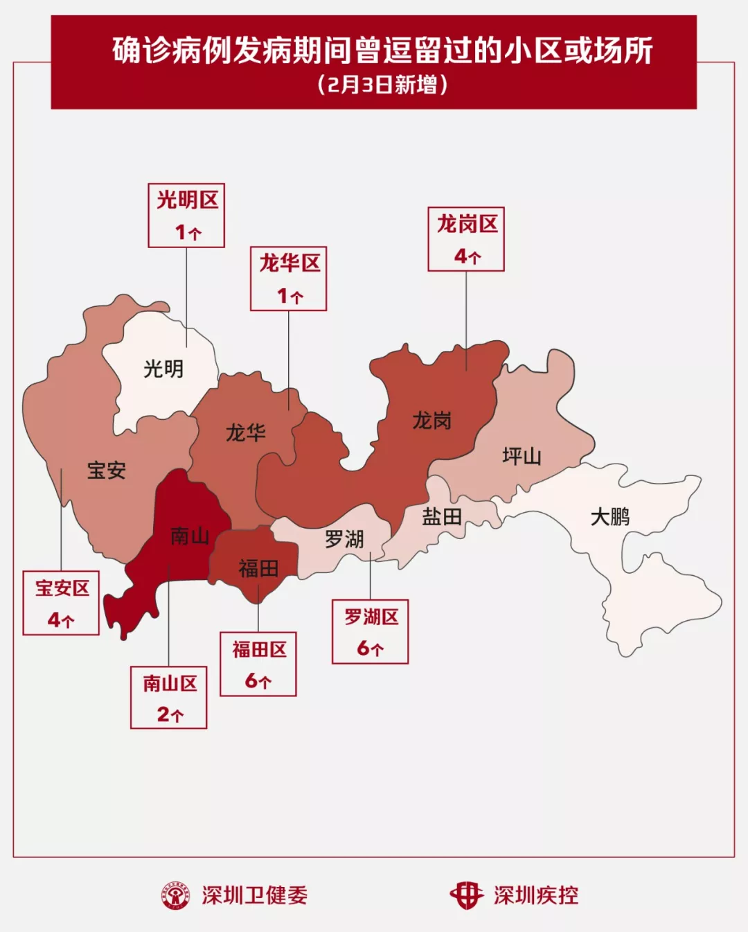 2月3日,疾控專業(yè)人員通過最新的流行病學(xué)調(diào)查確認,深圳新增24個小區(qū)(場所),有新確診的病人在出現(xiàn)病征期間曾經(jīng)逗留。