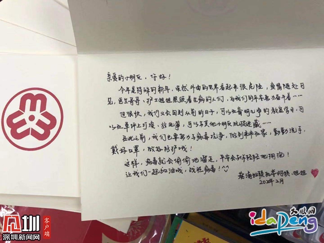 除了疫情防護(hù)的必需品,記者在這份暖心的“抗疫禮包”中還發(fā)現(xiàn)了一封字跡工整的信。信中寫道:親愛的小朋友,你好!今年是特殊的新年,雖然外面的世界看起來(lái)很危險(xiǎn),疫情隨處可見,醫(yī)生哥哥、護(hù)士姐姐照顧著生病的人們,為我們的平安努力奮斗著,但很快,我們又會(huì)回到從前的日子……劉贊告訴記者,這些漂亮的字跡出自她的同事肖可之手,雖然沒能跟姐妹們一起慰問(wèn),但肖可還是希望能盡自己的一份力,讓這份禮包更加溫暖,讓孩子們更加快樂開心。