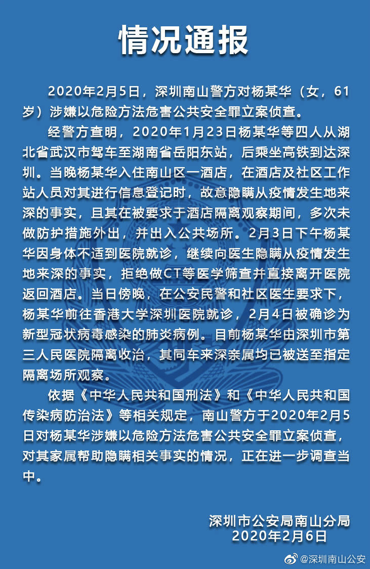 依據(jù)《中華人民共和國刑法》和《中華人民共和國傳染病防治法》等相關(guān)規(guī)定,南山警方于2020年2月5日對楊某華涉嫌以危險方法危害公共安全罪立案偵查,對其家屬幫助隱瞞相關(guān)事實的情況,正在進一步調(diào)查中。