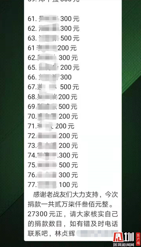 “各位戰(zhàn)友,現(xiàn)在疫情形勢如此嚴峻,正是需要我們排憂解難的時候,我們不能袖手旁觀,現(xiàn)向戰(zhàn)友們發(fā)起防護口罩捐助倡議……”早在2月2日,林貞輝便在翠竹街道退役軍人微信群里發(fā)起捐款倡議。捐款的倡議一發(fā)出,便得到熱烈響應,退役軍人們紛紛在群里接龍捐款:200元、300元、500元……微信群里的捐款數(shù)字不斷累加,不到一天的時間,便籌集到來自76位退役軍人的愛心善款27300元。