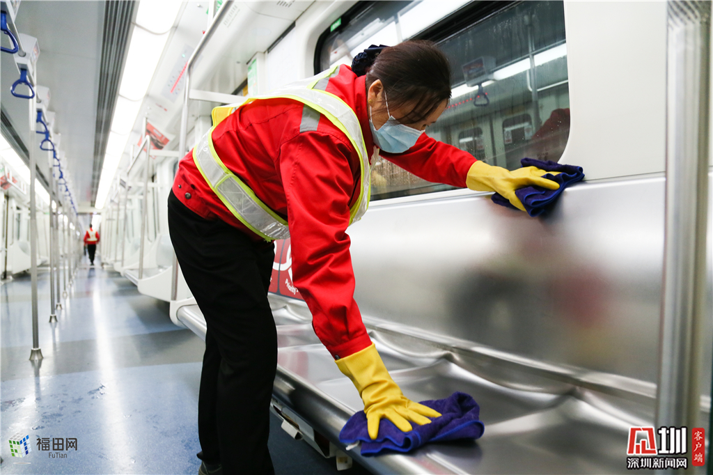 張軍香用剛剛兌好84消毒液,細(xì)心地為奔跑一天的列車消殺除菌。這段時間的23點-次日的7點,早上從這個區(qū)域車間駛出的第一批次列車就是保潔員張軍香所在團隊消殺清潔過的。16瓶高濃度的84消毒液,勾兌出近600斤消毒水,6個人分三組,140米的車廂,這段時間的每個夜晚,在這座城市最重要的交通工具上默默耕耘。
