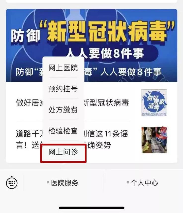 ①關注“深圳羅湖區(qū)人民醫(yī)院”的公眾號,點擊左下角菜單“醫(yī)院服務”→“網(wǎng)上問診”